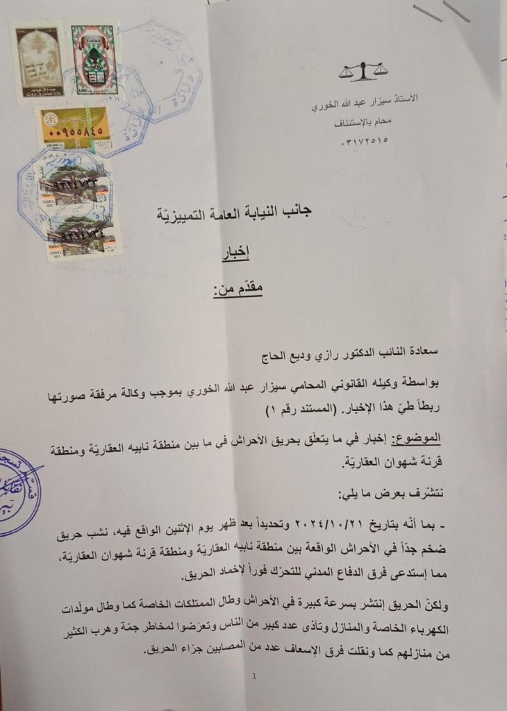 تقدم عضو تكتل الجمهورية القوية النائب رازي الحاج عبر وكيله القانوني المحامي سيزار عبدالله الخوري بإخبار إلى جانب النيابة العامة التمييزية حول حريق الأحراش في الربوة – المتن، ما بين منطقة نابيه وقرنة شهوان العقارية، وذلك لاجراء التحقيقات اللازمة لتبيان مفتعلي الحريق وملاحقتهم امام القضاء المختص.
