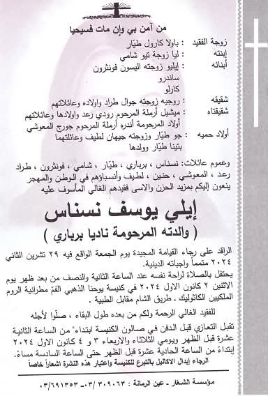 نعى الدكتور روجيه نسناس رئيس مجلس ادارة شركة اكسا ميدل ايست ورئيس المجلس الاقتصادي والاجتماعي سابقا، شقيقه ايلي نسناس الذي فارق الحياة وكتب على منصة التواصل الاجتماعي